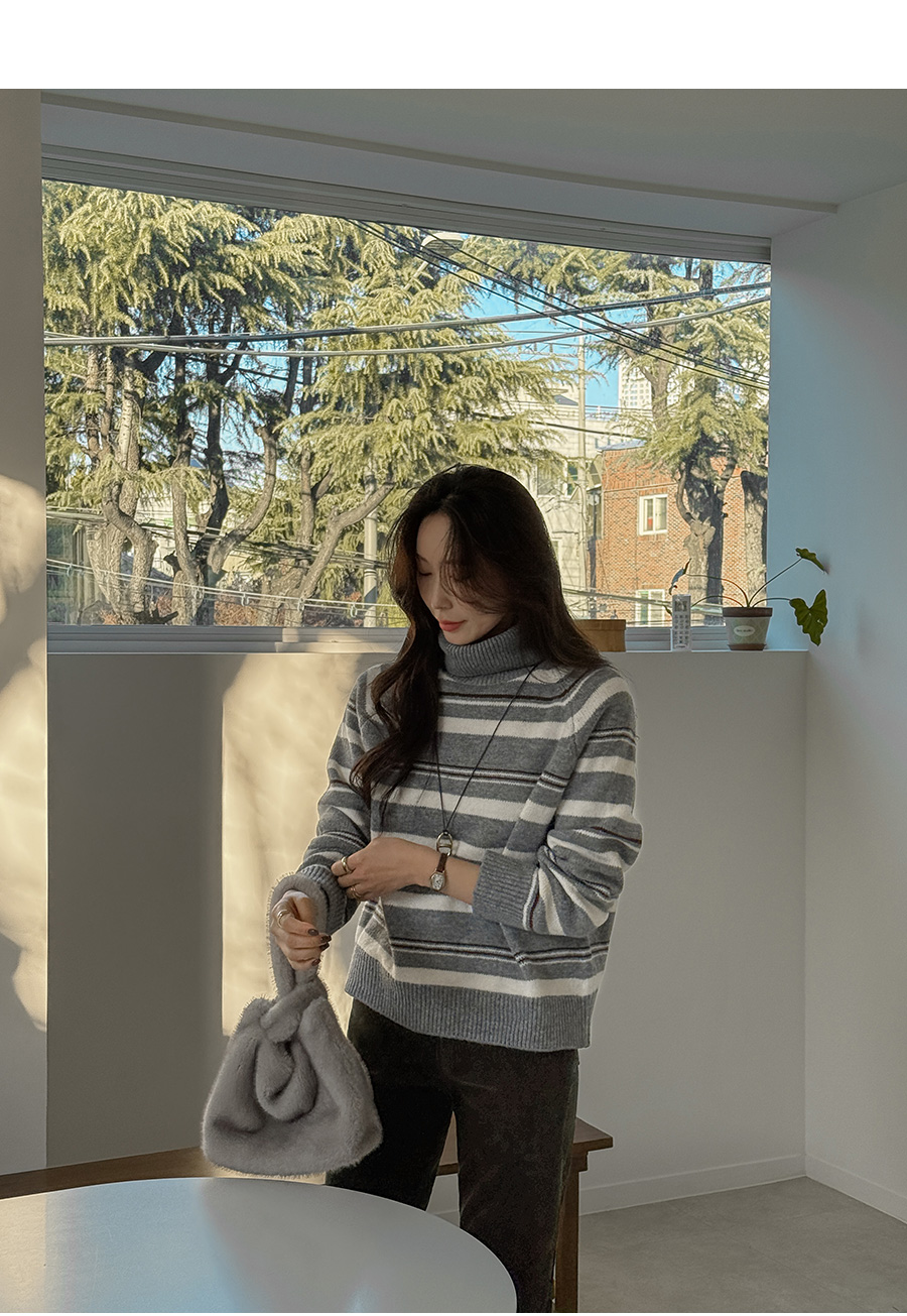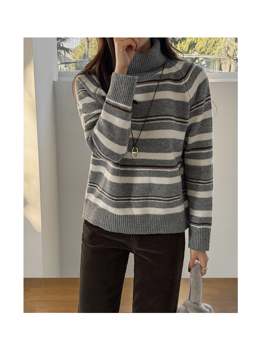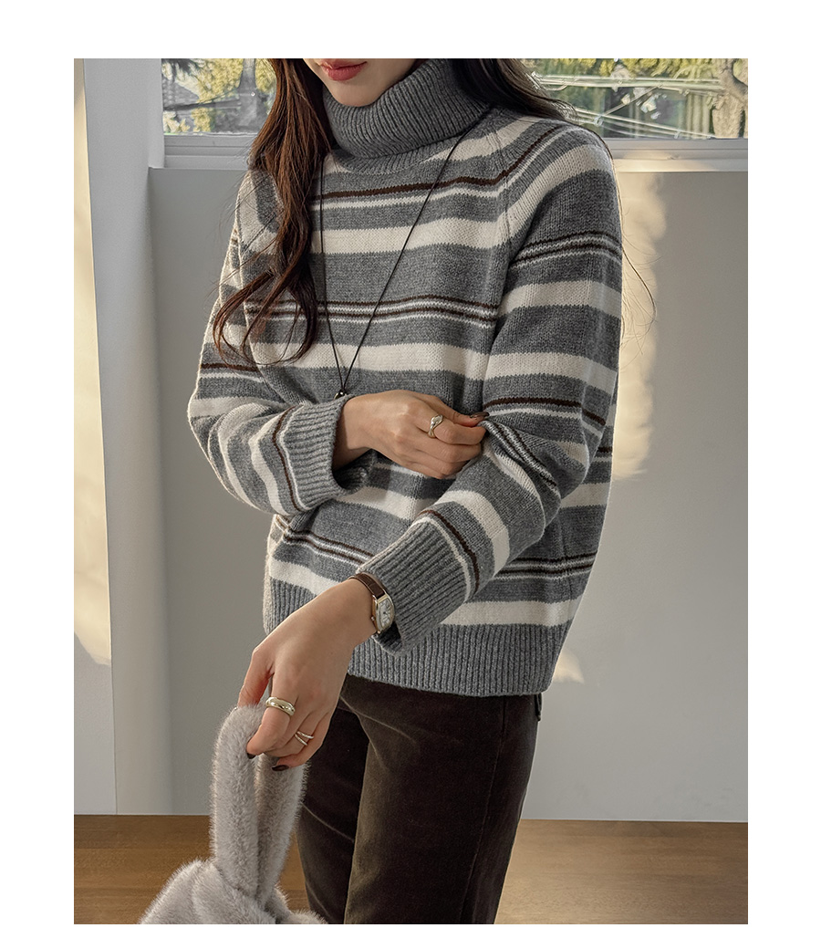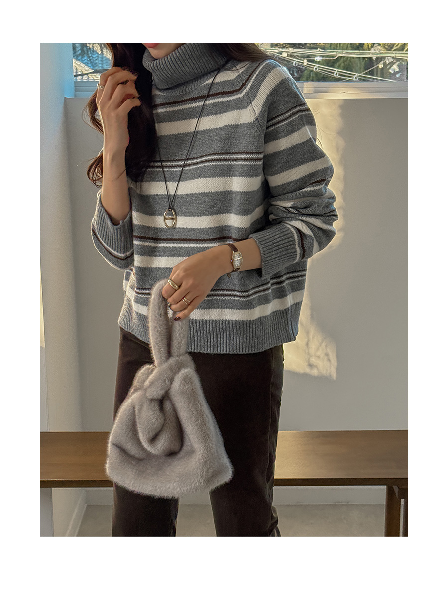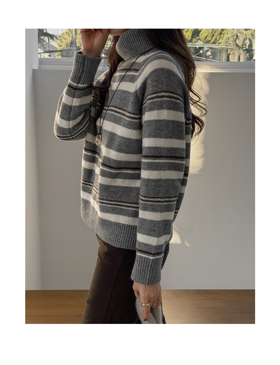 A turtleneck sweater with delicately colored stripes that provides warmth without being stuffy! (3 colors)