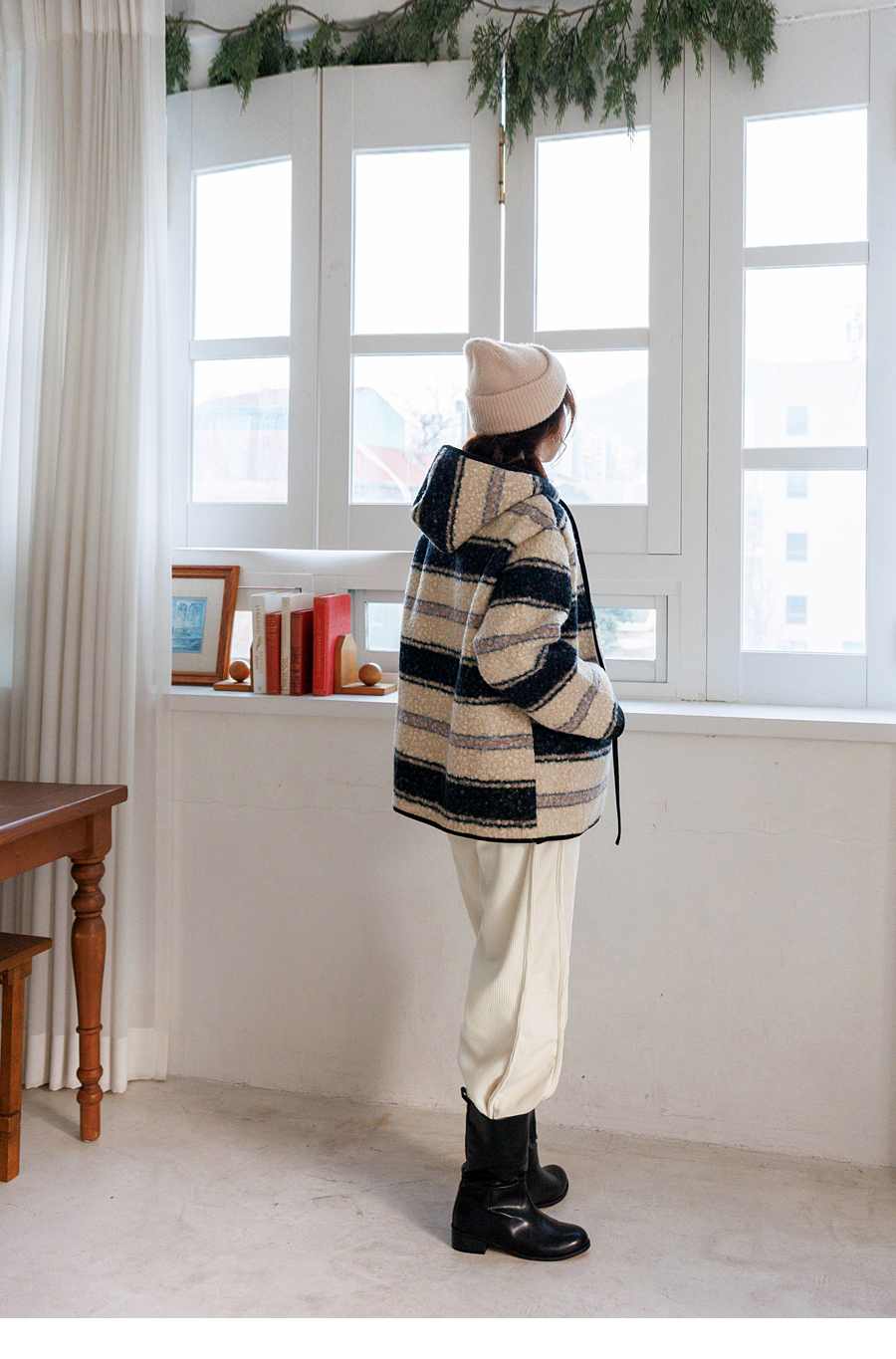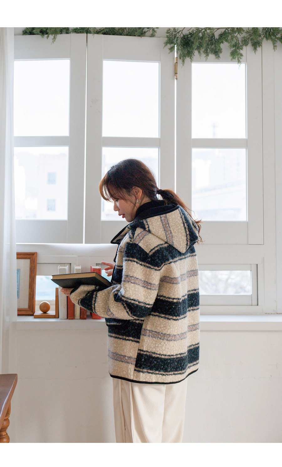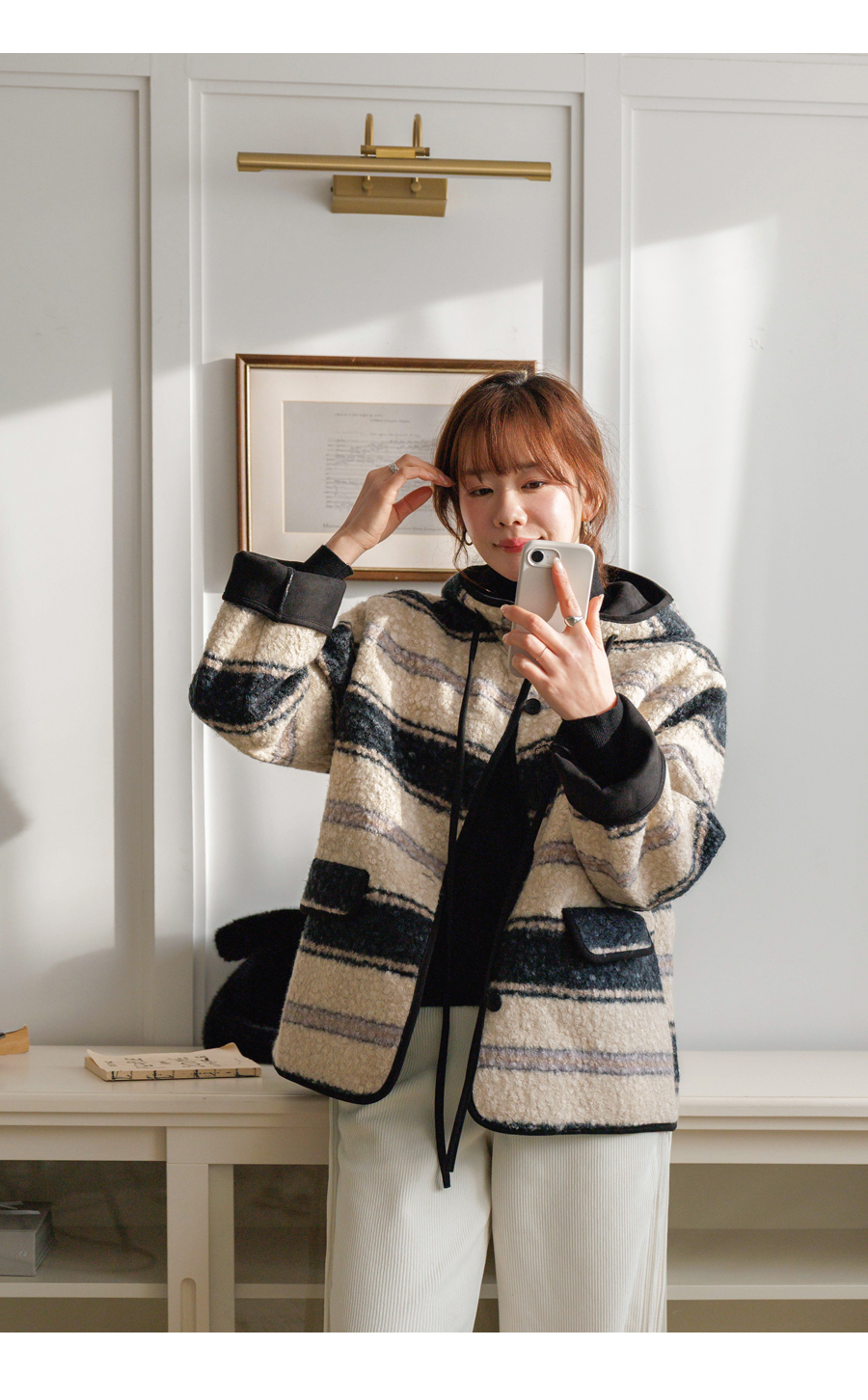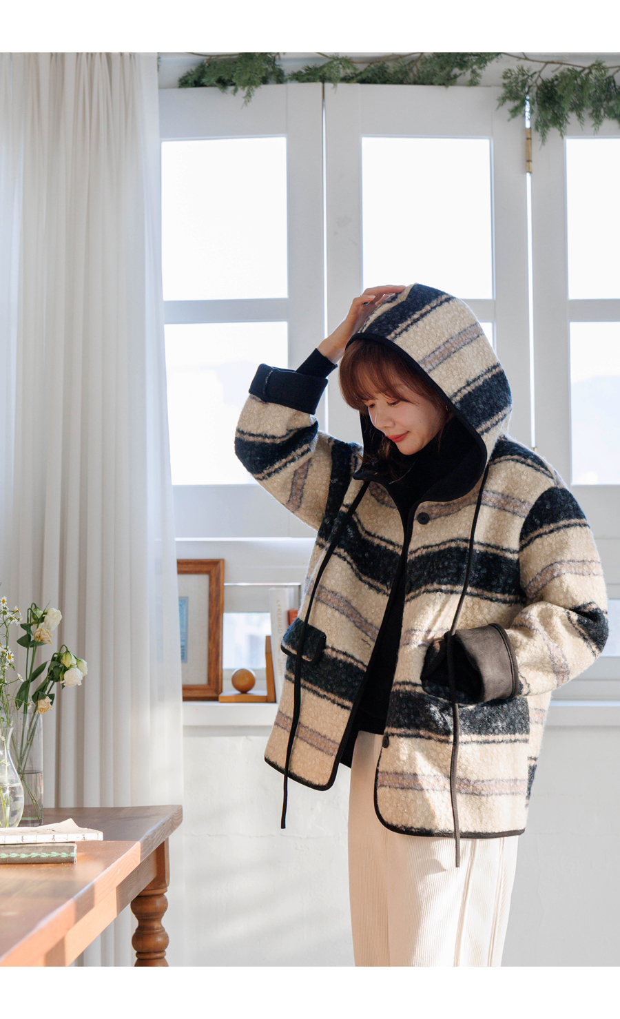 컬러 조합이 세련된 부클 후드 점퍼에요