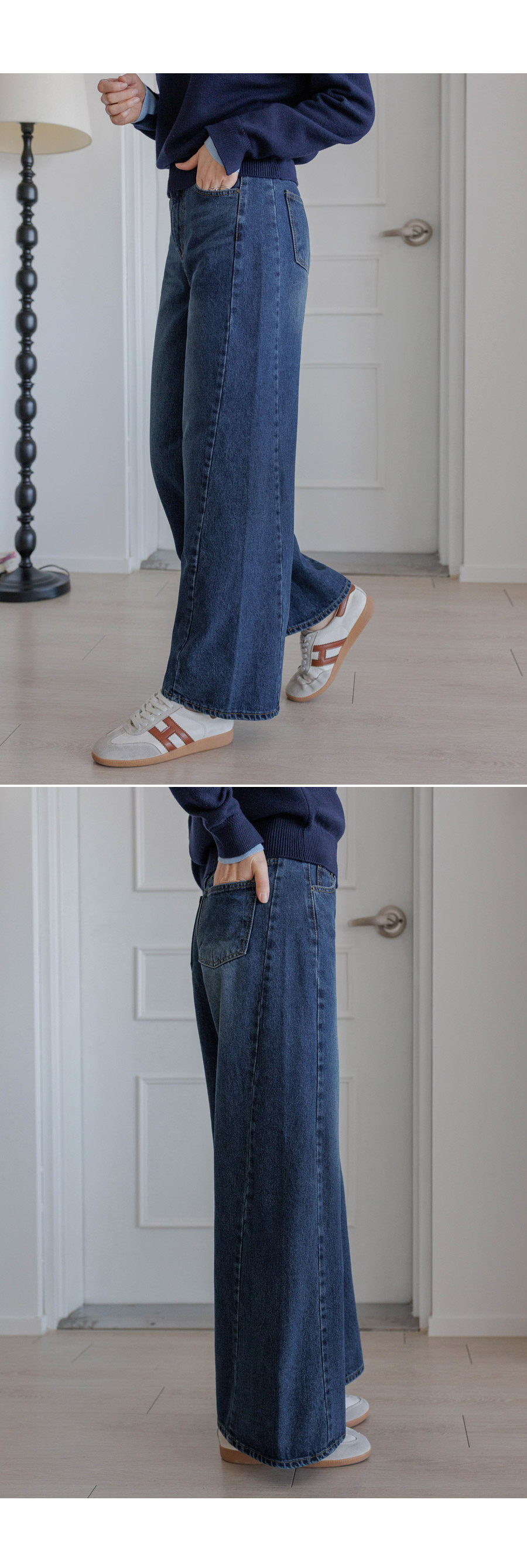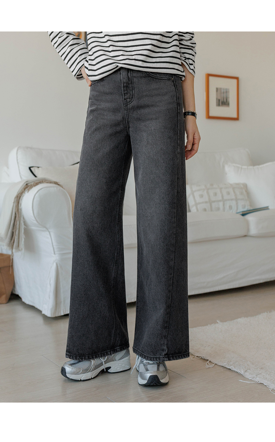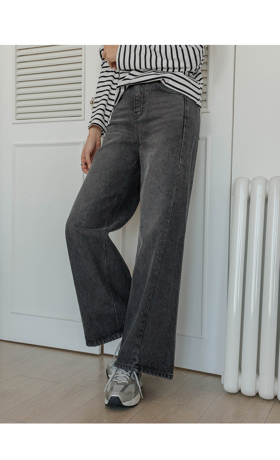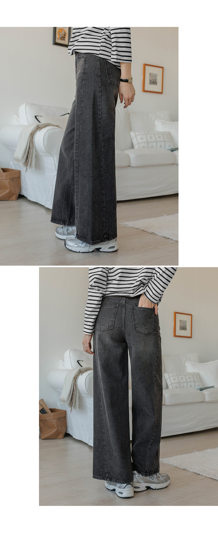 사이드 절개 라인으로 플레어지는 입체감 있는 와이드 데님