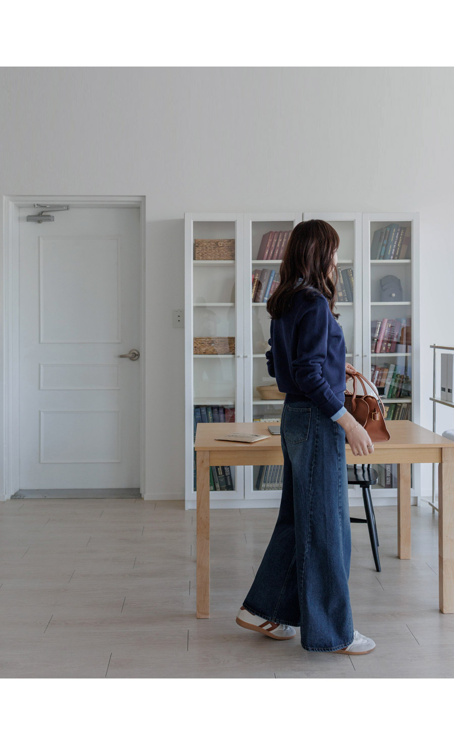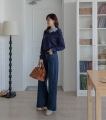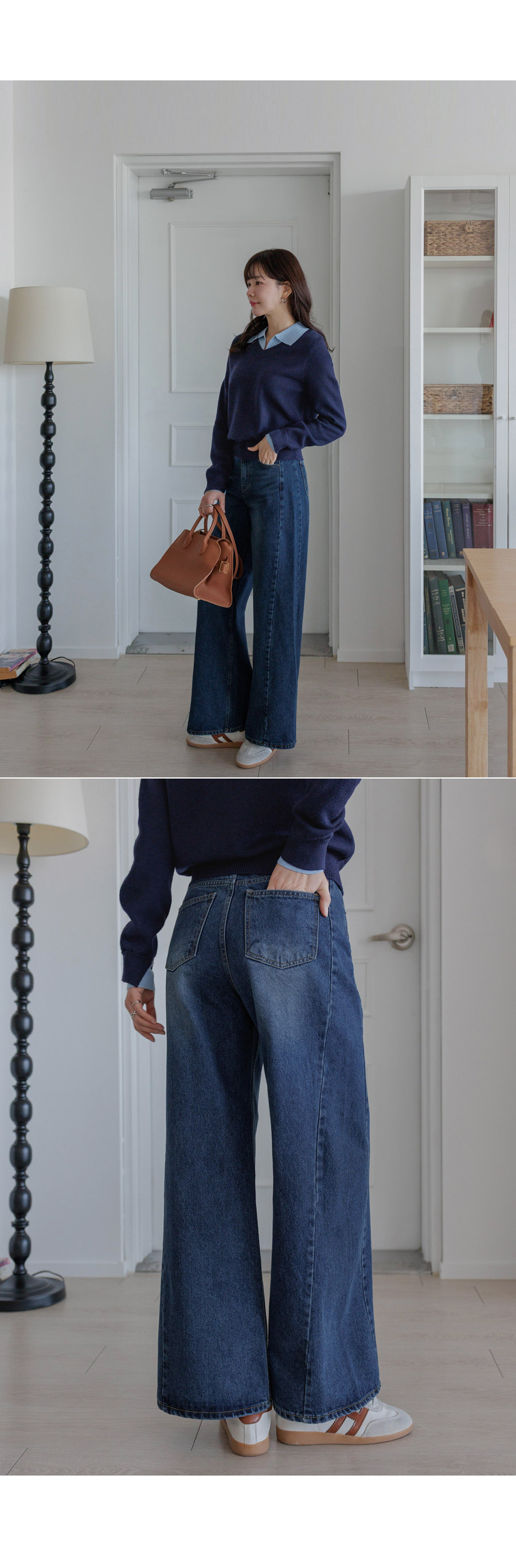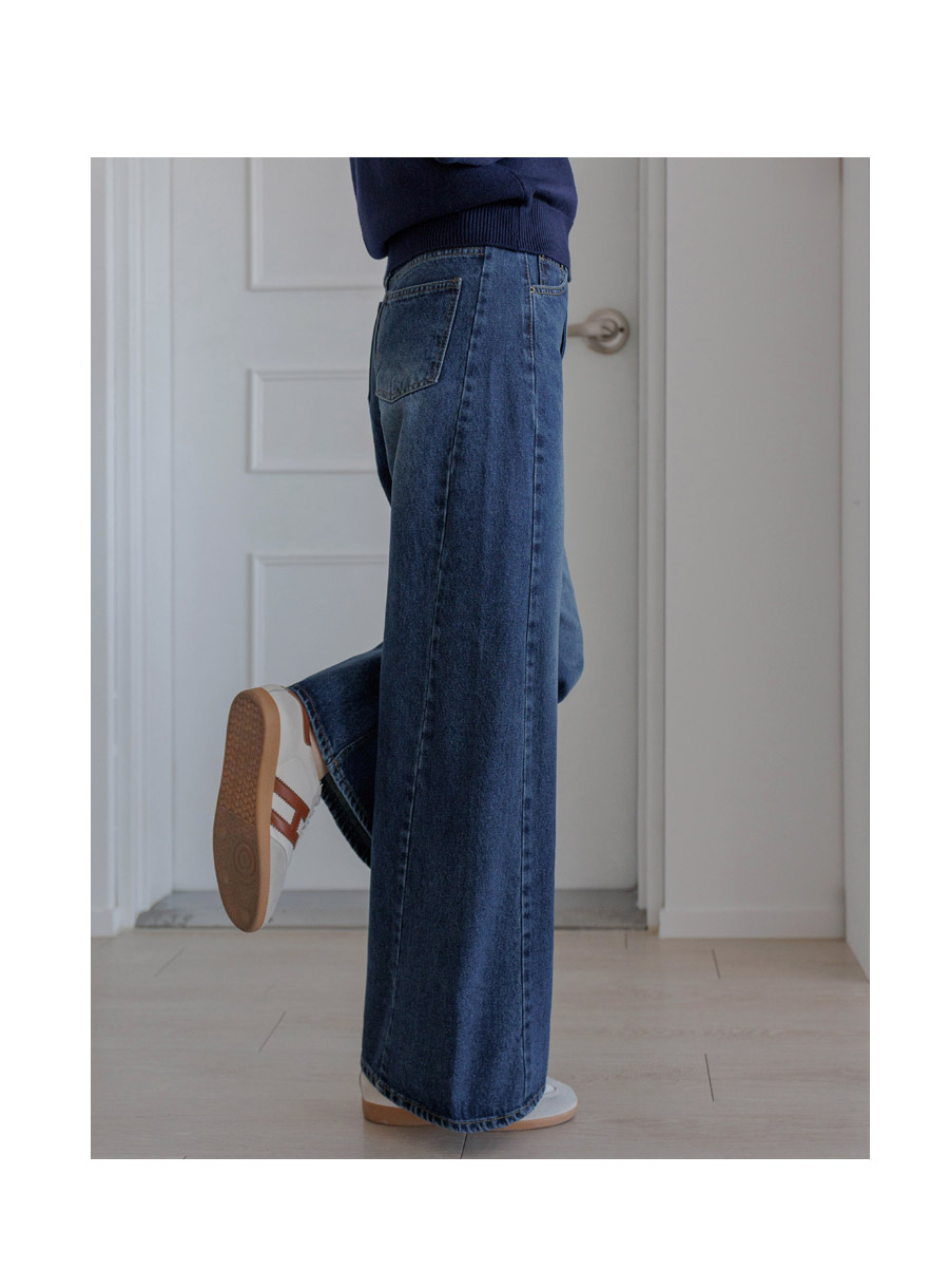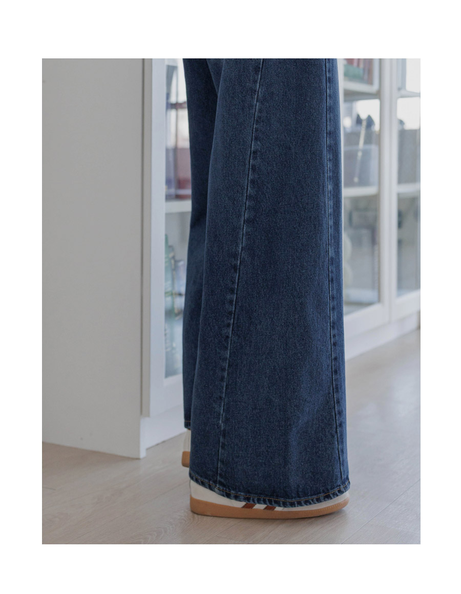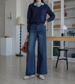 사이드 절개 라인으로 플레어지는 입체감 있는 와이드 데님