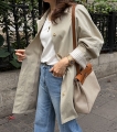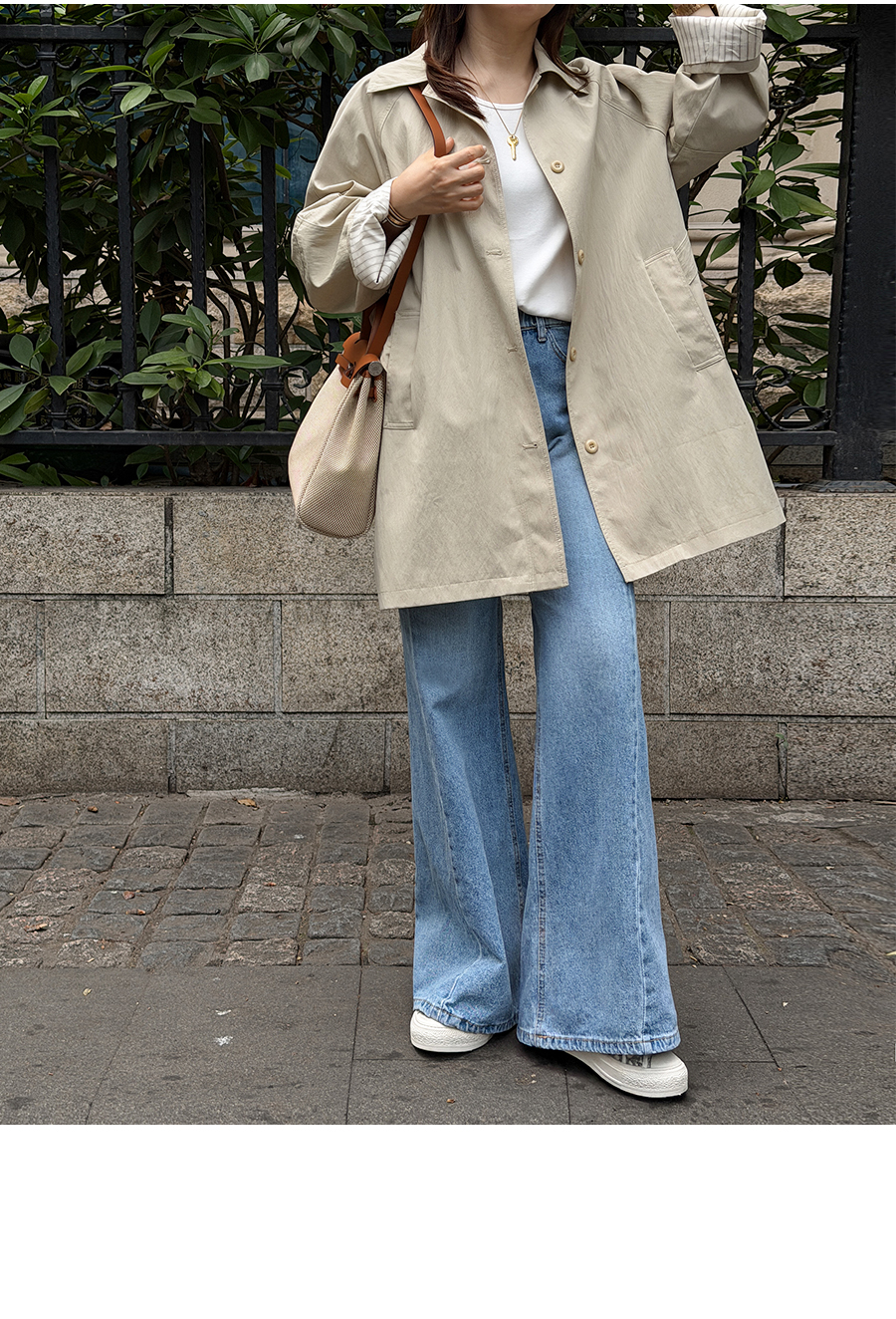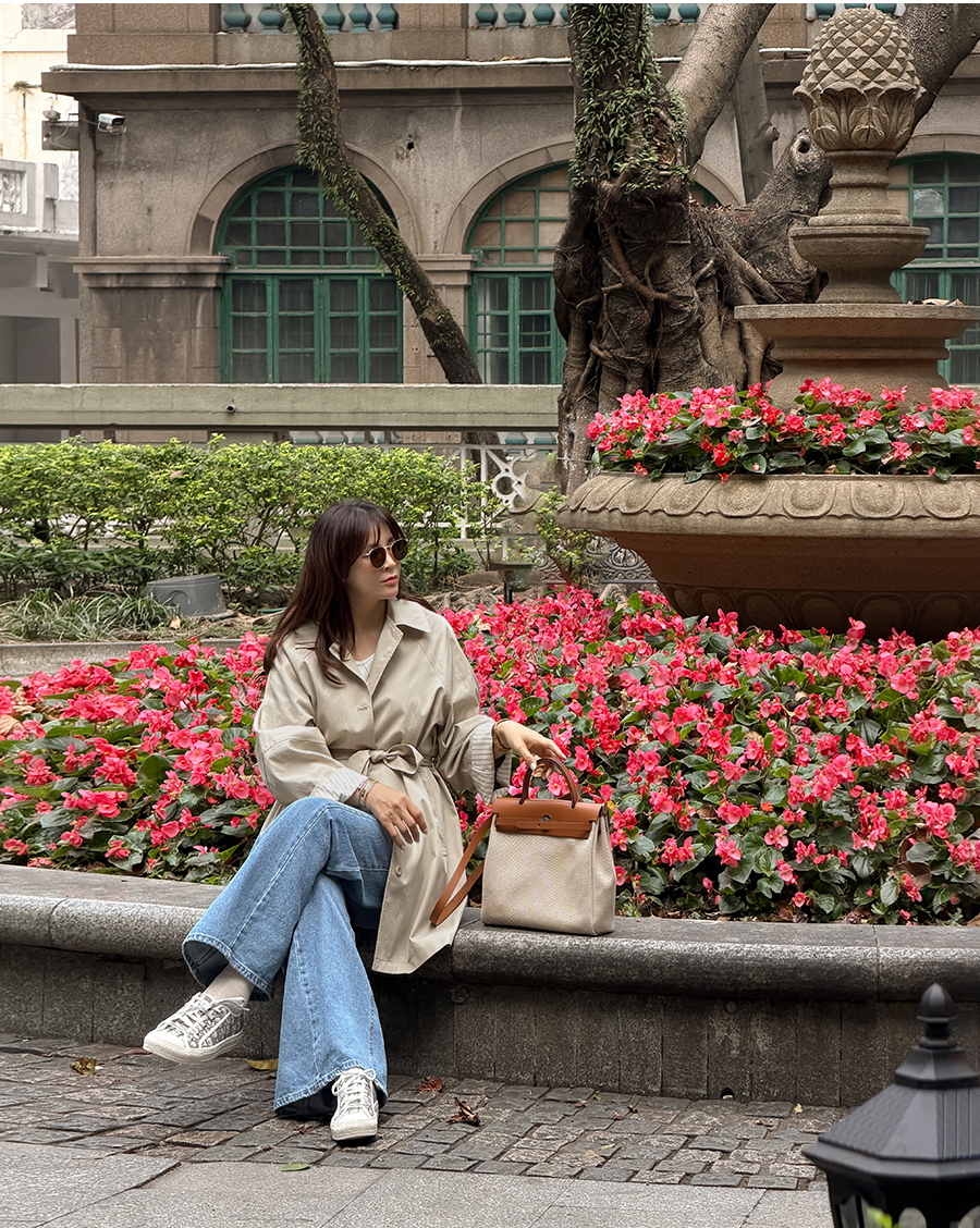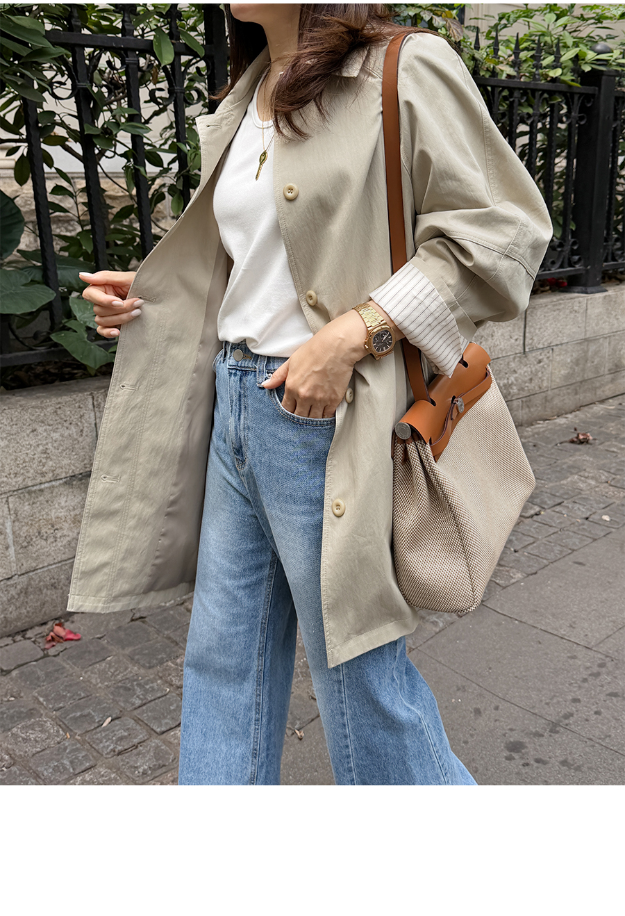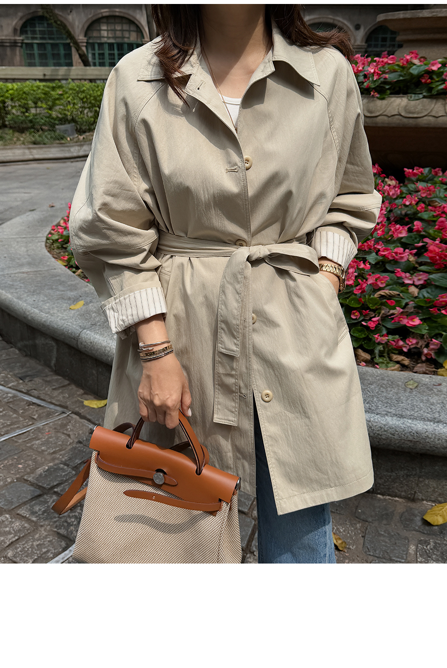 소매 스트라이프 배색으로 포인트를 준 세련된 하프 트렌치
